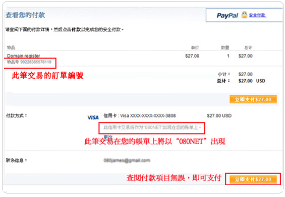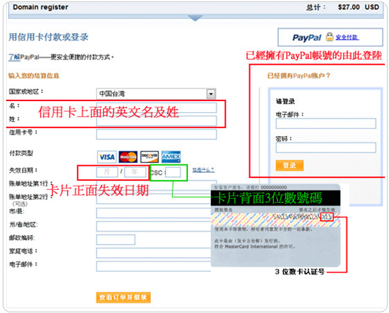 在畫面左邊是用普通信用卡付款的界面,右邊是擁有PAYPAL帳號的客戶付款的頁面。(如圖1)