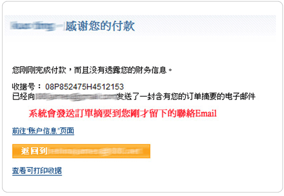 支付成功後,系統會發送訂單摘要到您留的聯絡Email信箱中,付款完成。我們系統即刻會收到您的入款,並在工作時間(週一~週五 9:00~18:00)内處理您的訂單。